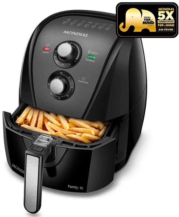 A Air Fryer Mondial AFN-40-BFT é uma fritadeira elétrica sem óleo projetada para preparar alimentos utilizando circulação de ar quente. Com capacidade de 4 litros e potência de 1500W, o modelo atende principalmente ao uso doméstico.