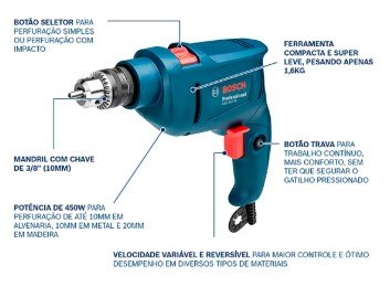 A furadeira de impacto Bosch 450W 10mm GSB 450 RE com jogo de brocas e bits 300 peças é uma ferramenta elétrica poderosa e versátil destinada a usuários que precisam realizar perfurações em diferentes materiais, desde madeira e metal até alvenaria. Equipada com motor de 450W e volante de impacto integrado, esta furadeira da Bosch oferece desempenho equilibrado para tarefas de bricolagem, pequenos reparos domésticos e projetos DIY com precisão e segurança, graças ao seu design ergonômico e confiabilidade da marca Bosch.