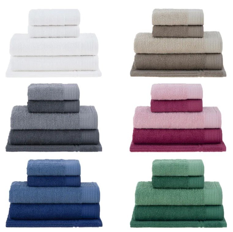 - Conteúdo: 2 toalhas de banho 70×132 cm, 2 toalhas de rosto 48×75 cm, 1 toalha de piso 48×70 cm canelado