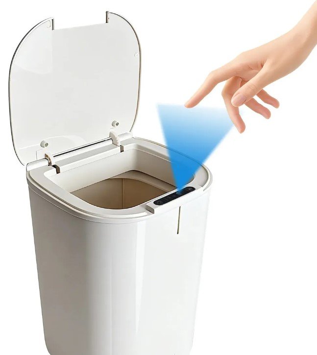 O sensor detecta movimento próximo à tampa, acionando a abertura automática, o que facilita o uso principalmente em cozinhas, banheiros e escritórios.